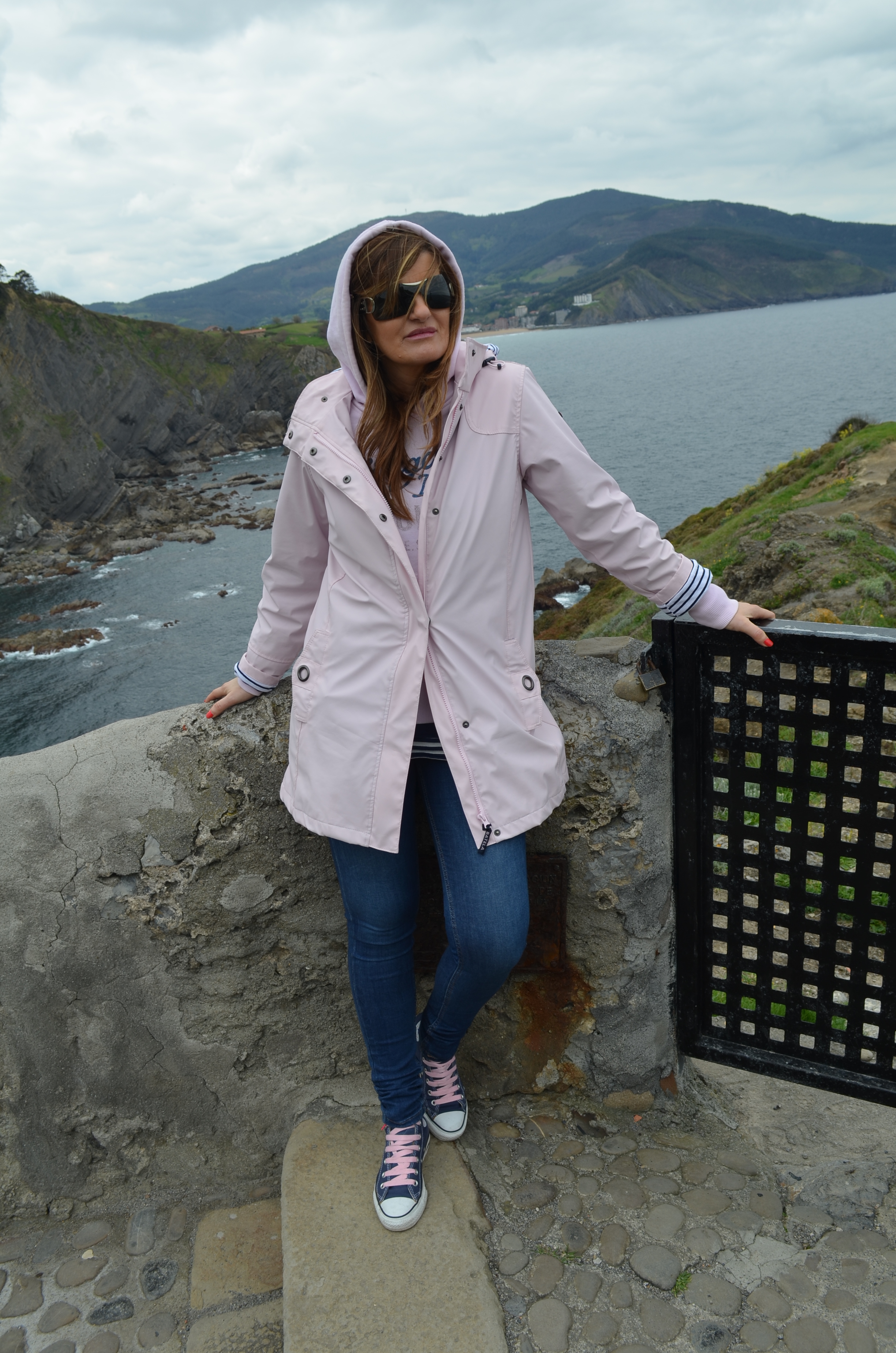 El look para esta aventura tiene un toque navy, desde la chamarra típica de pescador en versión «calle», combinada con unos jeans leggins y unas all stars converse que he customizado con unos cordones rosas a juego de la chamarra pescador, un estilo completamente informal y cómodo para esta ruta de sube y baja.