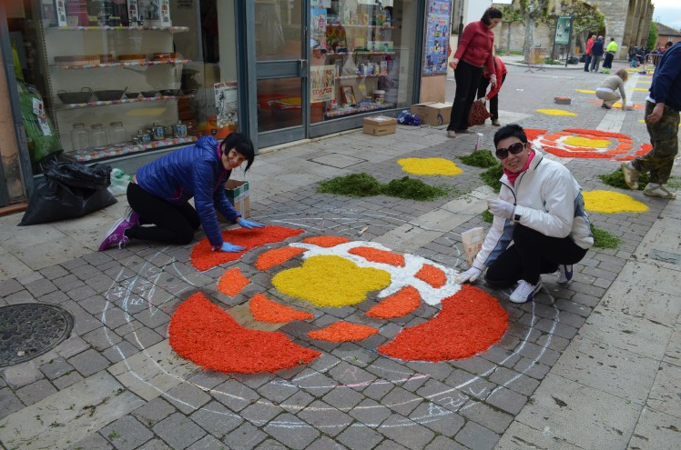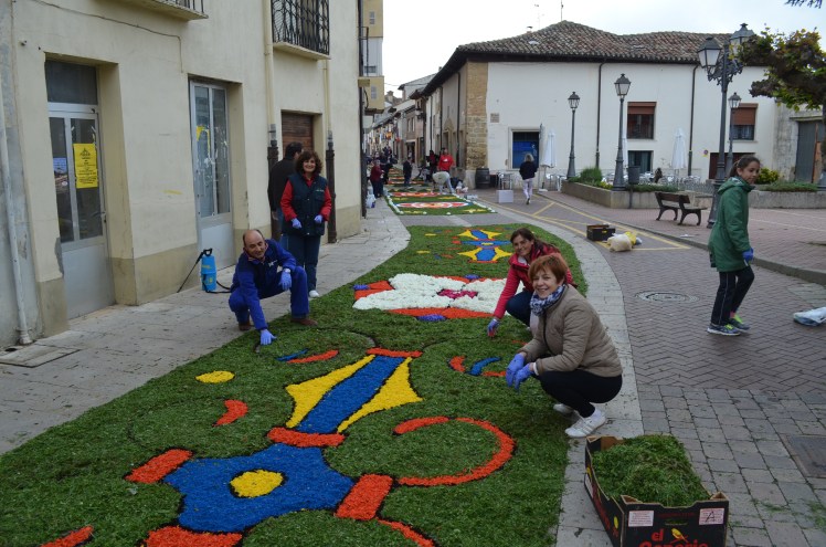 Y ahora los verdaderos artistas de estas bellas alfombras, el esfuerzo, la ilusión de todo un pueblo, sus vecinos donde dedican horas de trabajo de una manera desinteresada, se reúnen para decidir el diseño, elaboraciones y reparticiones del trabajo de esta espectacular belleza.
