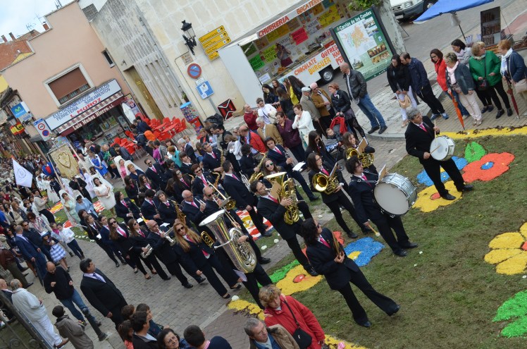 La Procesión encabezada con la banda de música y seguida por los niños que realizan la Primera Comunión, las damas de la villa con sus mantillas y peinetas, las cofradías, la Coral Carrionesa, las autoridades…