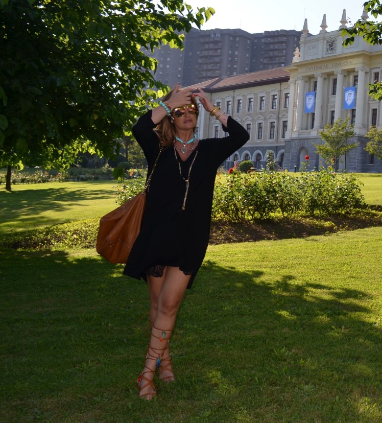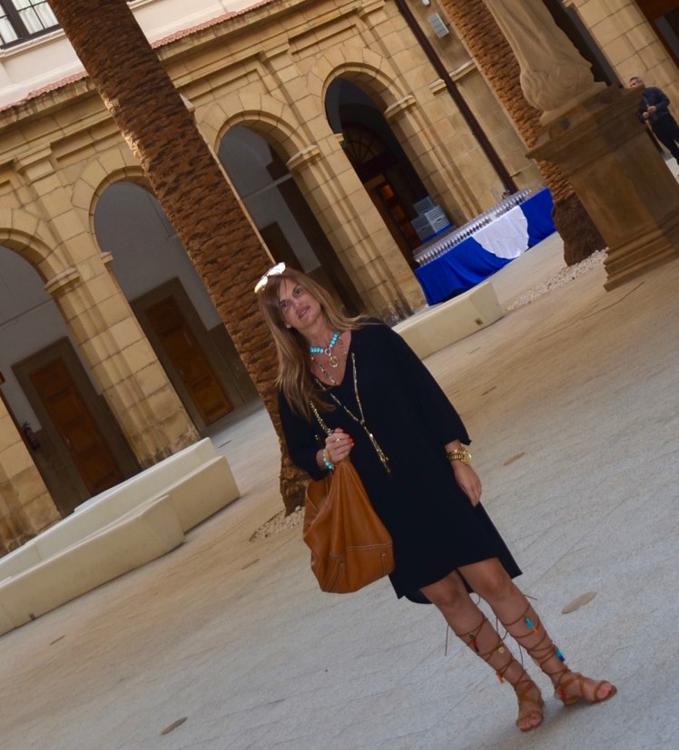 Y el estilismo para esta ocasión muy personal, un vestido de Hakei al que he añadido unas cadenas doradas con borlas en piel negro combinado con unas romanas customizadas por mi creando un diseño divertido y alegre.