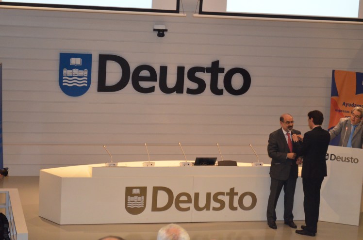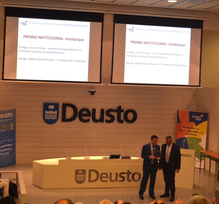 Premio Institucional a Innobasque, lo entrega el Vicerrector Emprendimiento y Formación continua de la Universidad de Deusto Victor Urcelay y lo recoge el Presidente de Innobasque Alberto García.