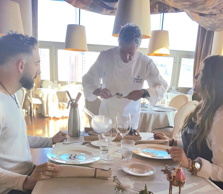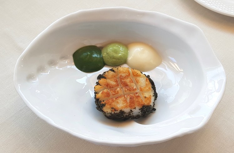 Ragout de Vieiras a la brasa , van con un crujiente que hacen con algas y con tres pures de espinaca, coliflor y albahaca…exquisito.
