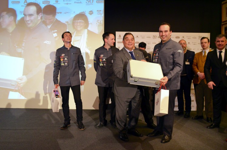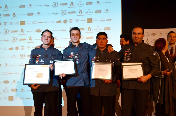 Nuestros cuatro finalistas, OMAR ECHAURE ganador de la III Semifinal de Camareros del Año; CARLOS PASCUAL (jefe de Rango/ Sumiller, Restaurante Azurmendi 3*Larrabetzu-Bizkaia; CÉSAR MORÁN (camarero de barra en Sanwicoffee-Bilbao, ganador del Premio Royal Bliss y de un curso personalizado de Latte Art de calidad Pascual con Adrián Fernández; y por último nuestro ganador del café JAGOBA SANTESTEBAN.